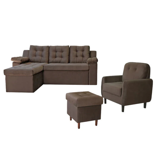 JUEGO DE LIVING ABBA RAVENA MARRON OSCURO + POLTRONA + PUFF