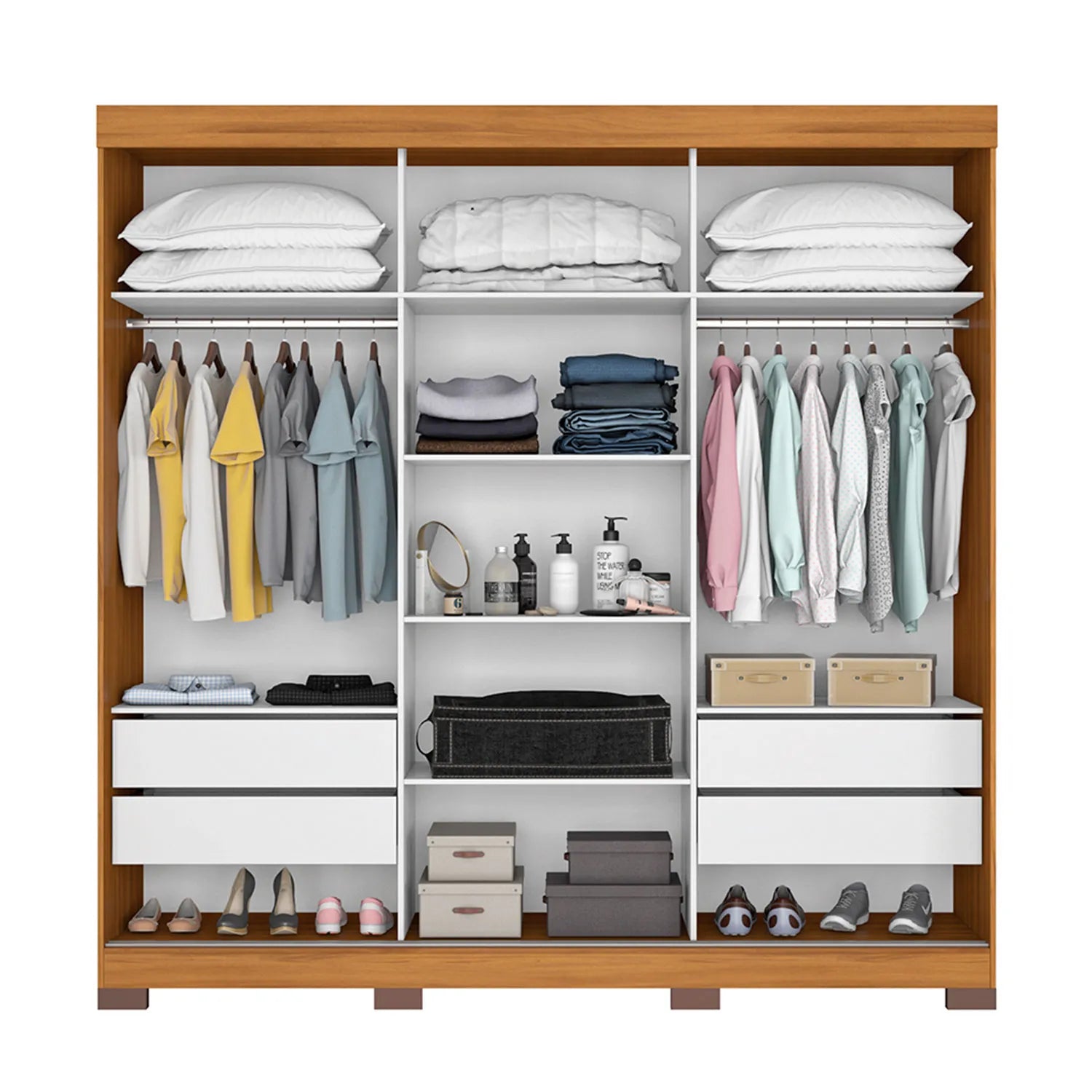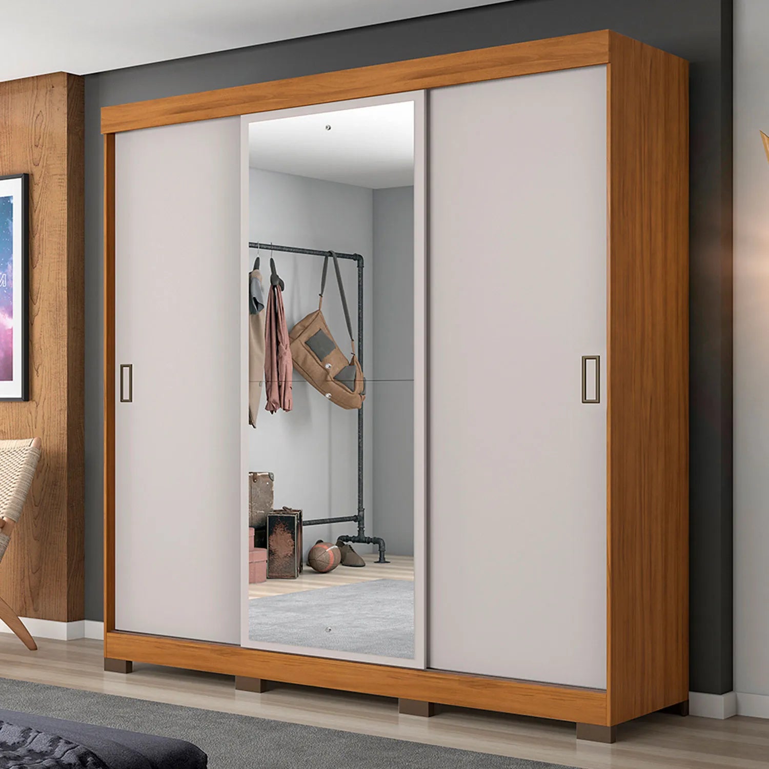 Artículo Detalle Tablero MDP 12–15 mm Acabado UV (Freijó fosco / Off‑White brillante) Puertas 3 deslizantes con riel de aluminio Gavetas 4, con guías telescópicas metálicas Estantes 5, carga hasta 8 kg c/u, 70 kg distribuidos Barras colgantes 2, aluminio, carga recomendable ±20 kg Espejo 1, vidrio 3 mm de 89 × 61,6 cm Pasteles 8 PVC de 5 cm