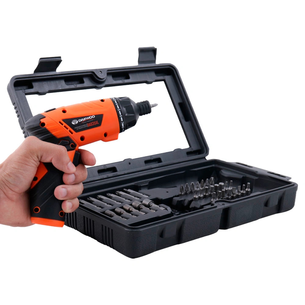 El atornillador Daewoo DAS35XL es una herramienta portátil, liviana y recargable, diseñada para tareas de atornillado en el hogar, oficinas o uso ligero profesional. Con batería de 3,6V, par de 2,5 Nm y diseño ergonómico, brinda comodidad y precisión. Ideal para armar muebles, colocar bisagras o realizar reparaciones rápidas. Incluye estuche rígido y kit de puntas.