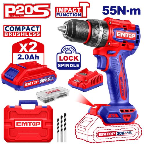 Taladro Percutor 13mm BL. 55Nm 2x Bat. 20V 2Ah (Compact) (M) Emtop